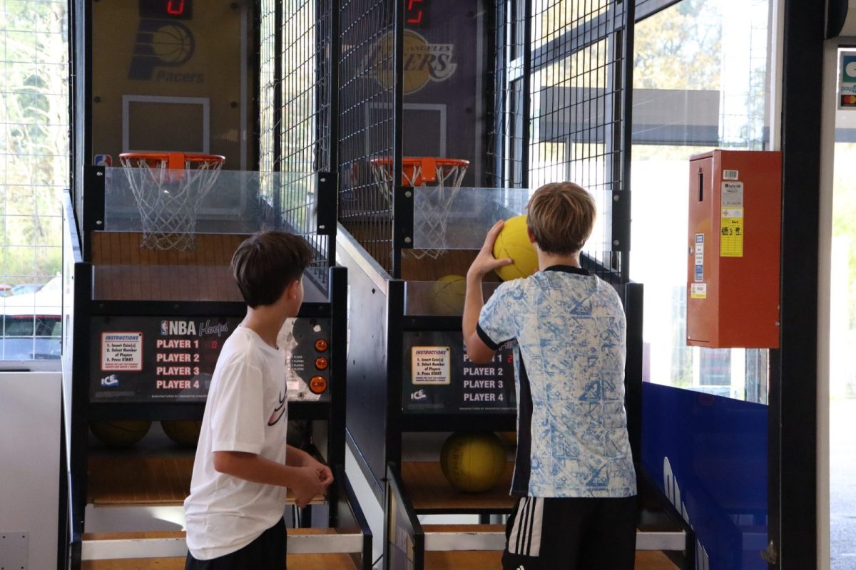 > BASKETBALL ZONE: An area equipped with two trampolines and basketball hoops. It's a highly entertaining sporting activity.