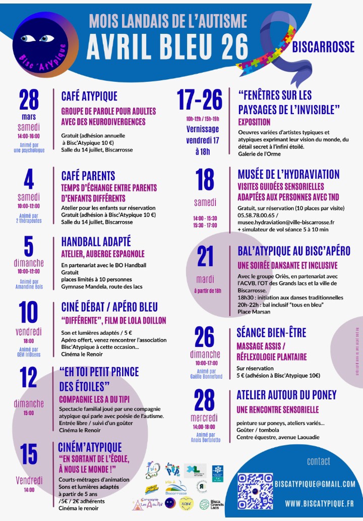 As in previous years, the Biscarross association Bisc'Atypique is taking an active part in the Landes autism month, Avril Bleu, with a wide range of local activities, in collaboration with the GEM IriDsens and other local partners.
