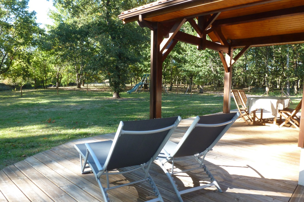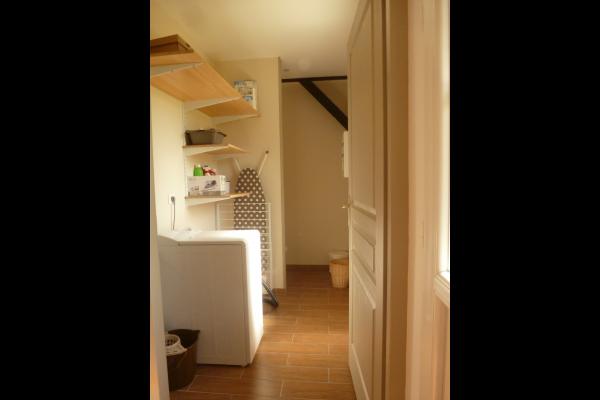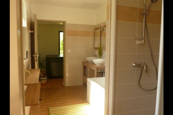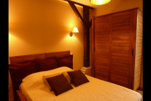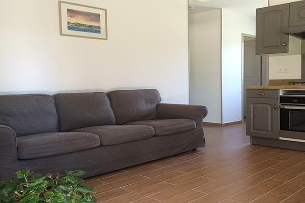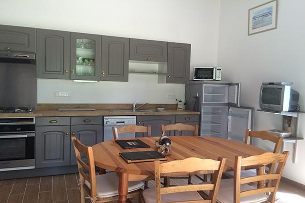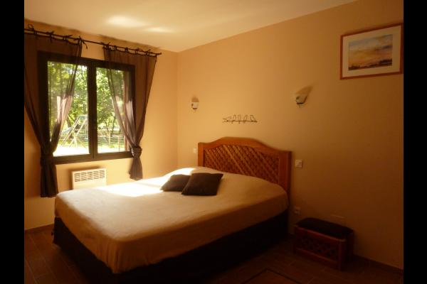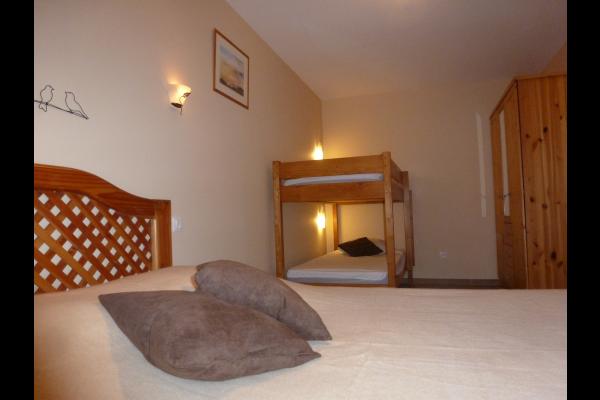 The 81 m² gîte sleeps two to six people. It comprises two bedrooms, one with a 140 cm double bed and a family room with a 160 cm double bed and 90 cm double deck bunk beds. A 21 m² kitchen/living room gives onto a covered terrace with a wooden deck. The kitchen area is fully equipped with a dishwasher, 4-ring oven, microwave oven, freezer-fridge. A bathroom with double vanity unit has a small bathtub and a hair dryer. A utility r