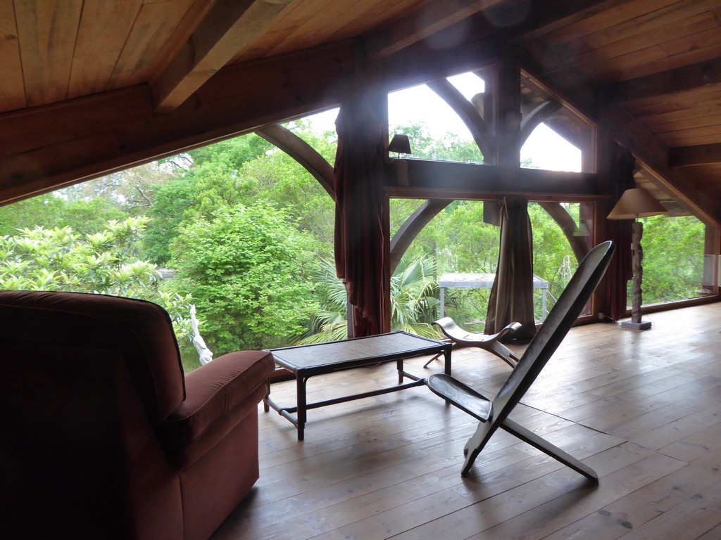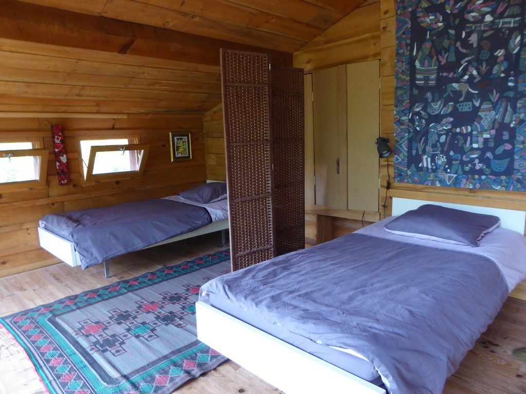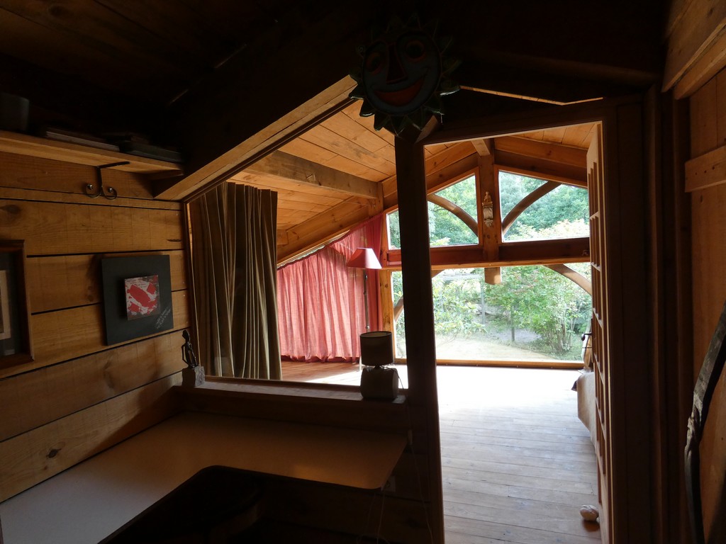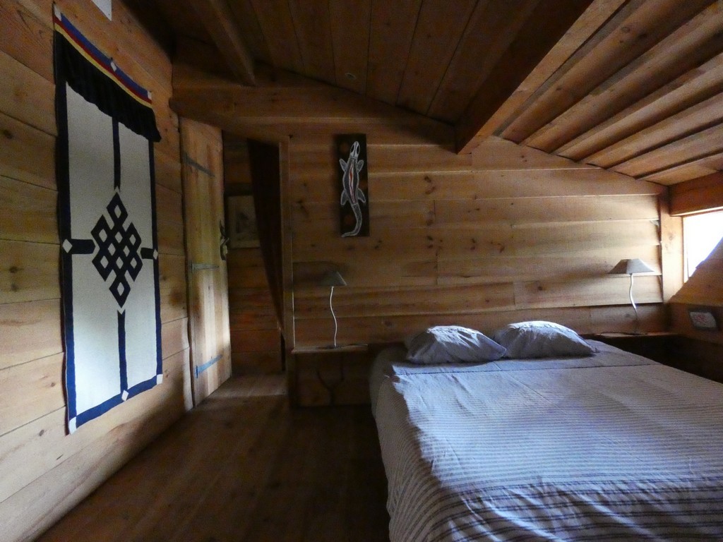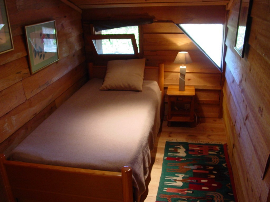 The other 2 bedrooms are upstairs. The first (bedroom B) has a double bed, a single bed and a crib. It's a suite of 2 interconnecting bedrooms. The second (room C), with private bathroom and study, has a double bed and 2 single beds. It features a large bay window running the full length and height of the room. It boasts a breathtaking view.