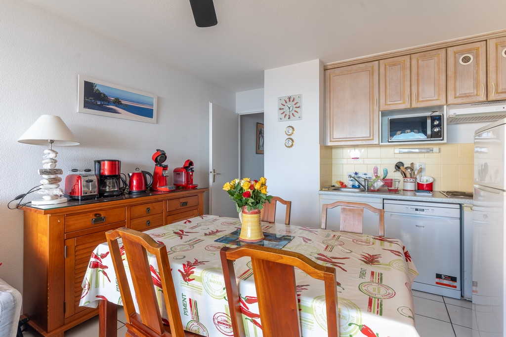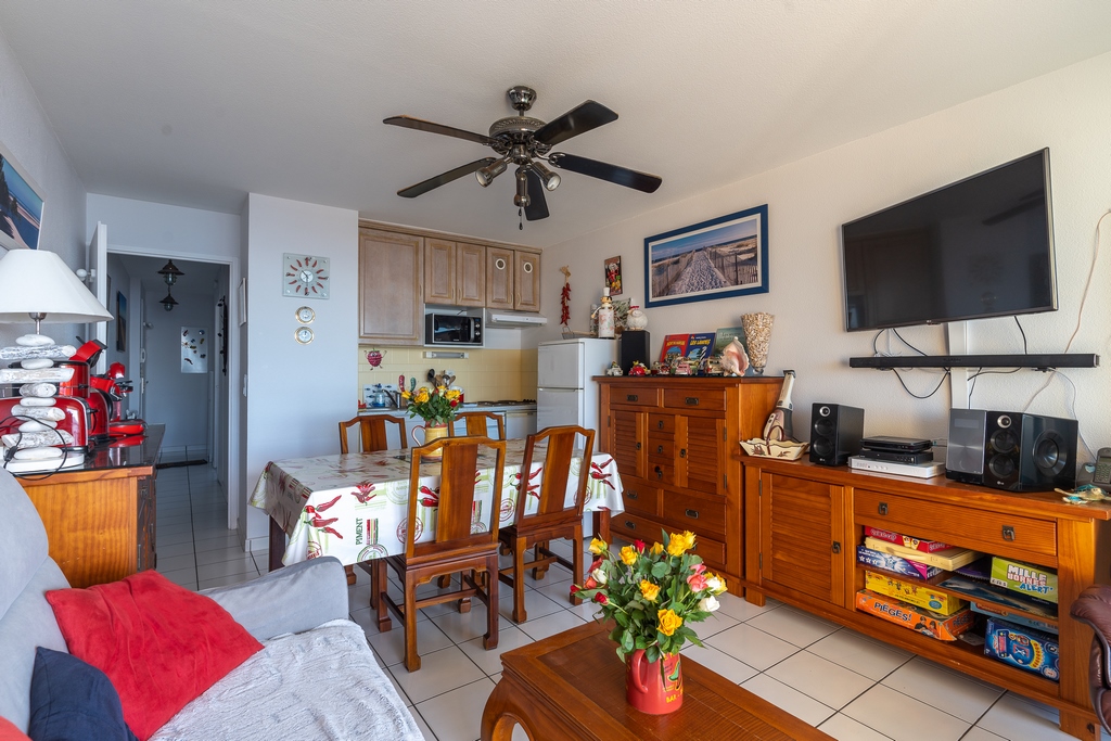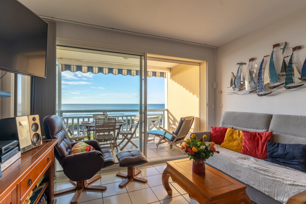 The 35m2 apartment is on the 2nd floor, with a living room with balcony overlooking the seafront, fitted kitchen (microwave, extractor hood, 4-ring electric hob, 2 fridges, dishwasher), bathroom with shower and toilet and one bedroom. The balcony (7m2 with electric canopy) is west facing so you can admire the sunset. Direct access to the huge sandy beaches and pedestrian streets and the lively centre of the seaside resort.
