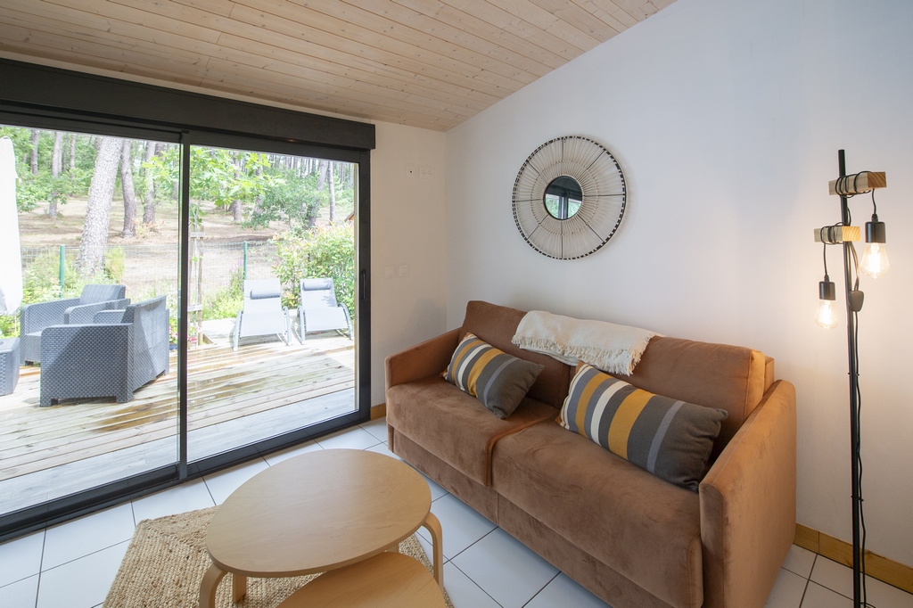A bedroom with a 140 cm sofa bed overlooking the forest and a bioclimatic pergola.