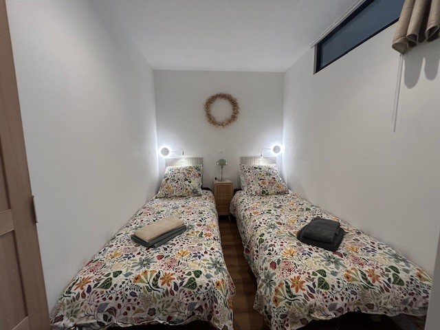 The bright, air-conditioned apartment features a spacious living room with lounge and dining area, a sleeping area with two 80cm beds that can be joined together to form a 160cm bed, a fully-equipped kitchenette, and a modern bathroom with walk-in shower and separate toilet.