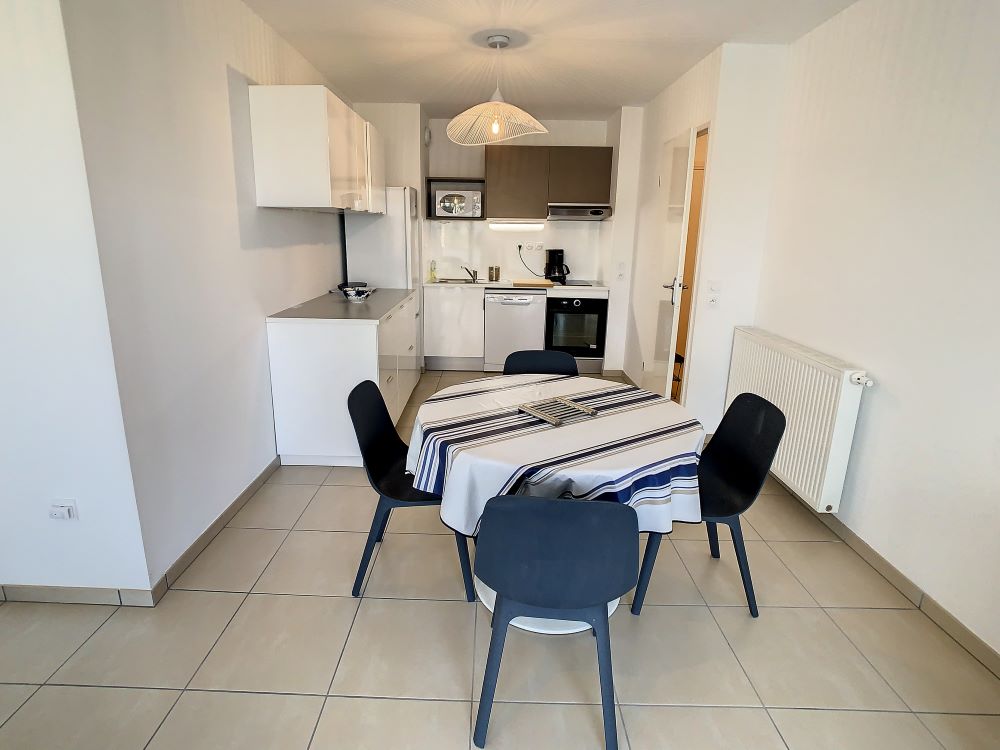 -fitted kitchen opening onto the living area, with fridge-freezer, induction hob, pyrolysis oven, microwave, extractor hood, dishwasher, coffee maker, kettle, toaster and all cooking and eating utensils