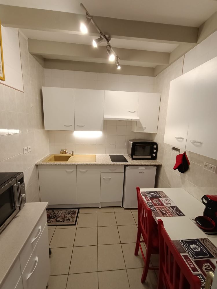 The living room opens onto a small terrace, perfect for enjoying the outdoors. The fully-equipped kitchen (hob, oven/microwave, fridge, coffee maker, utensils) allows you to prepare your meals independently.