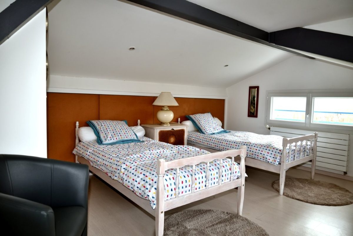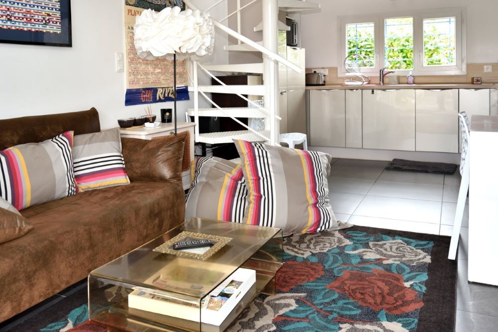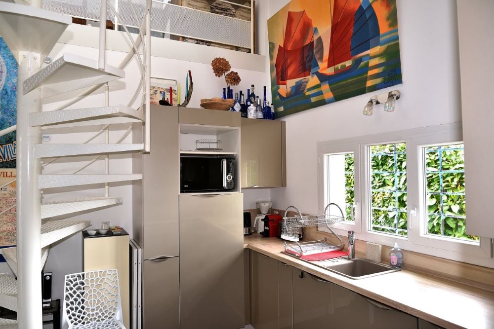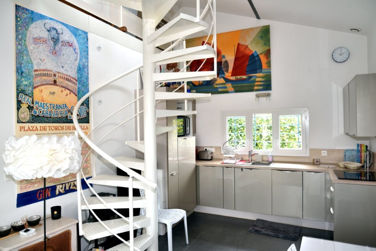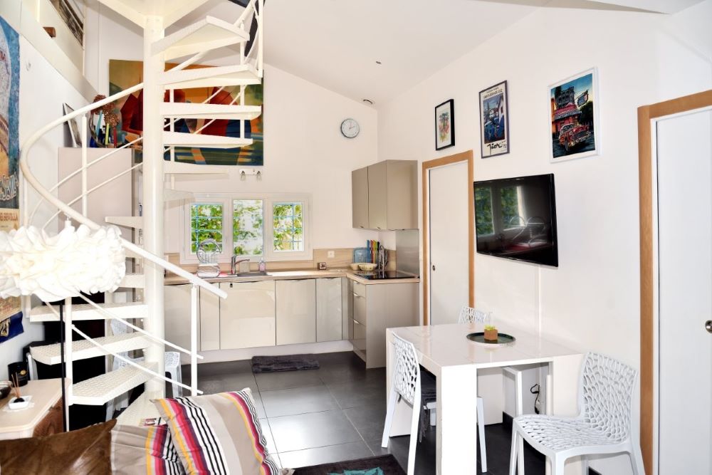 Set in a quiet, unoverlooked neighborhood, the first floor comprises a fully-equipped kitchen opening onto a cosy living room (TV, Wi-Fi), a bedroom (140cm bed), a shower room with walk-in shower, separate WC and plenty of storage space, and upstairs a mezzanine with two 90cm beds.