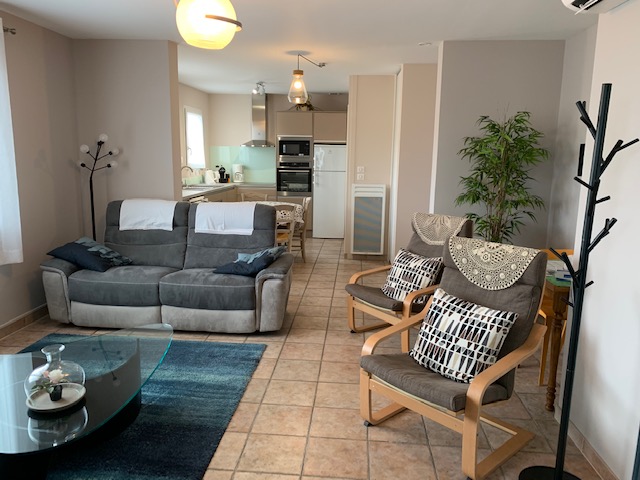 It comprises a living room with lounge and dining area opening onto a fitted kitchen with adjoining pantry, two bedrooms, a bathroom with walk-in shower and separate toilet.