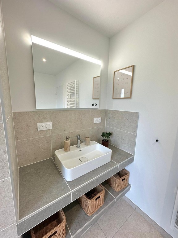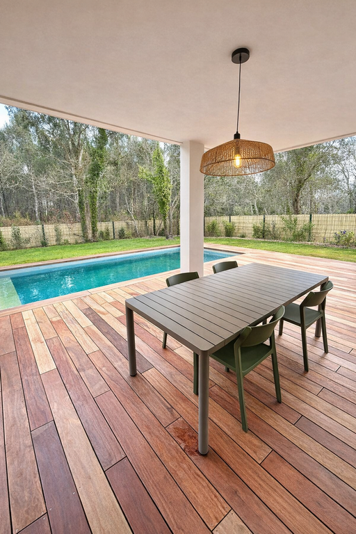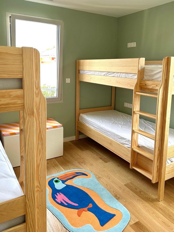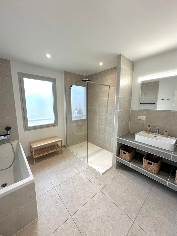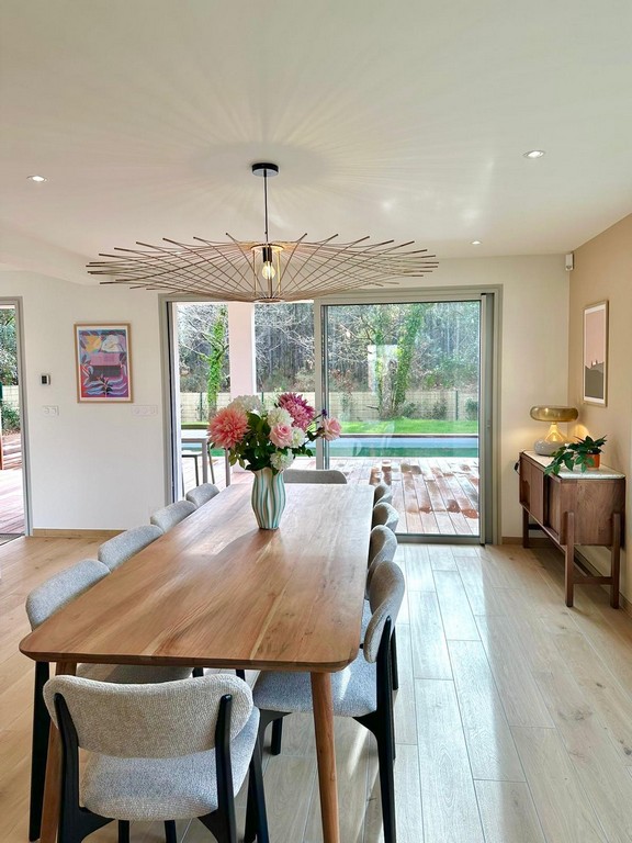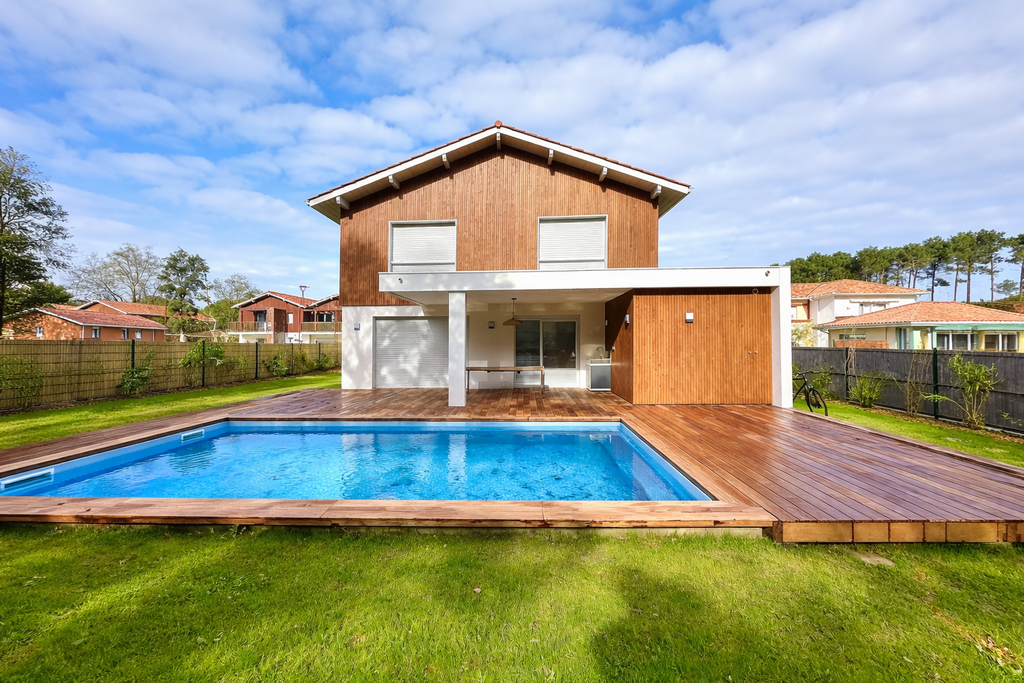 Bright, contemporary 180m² villa (2026), ideally located in a quiet cul-de-sac in Messanges, just a few minutes from the ocean and bike paths. It can accommodate up to 10 people, with 3 top-of-the-range double bedrooms, 1 children?s bedroom (4 beds) and 2 bathrooms. Living room with TV, dining room, fully equipped kitchen, laundry room, fiber Wi-Fi and full air conditioning. Outside: private heated pool, covered terrace with summer kitchen and plancha, enclosed garden planted with trees, direct access to bike path. Ideal for families, friends or surfers, in a verdant setting close to the beaches of the Landes region.