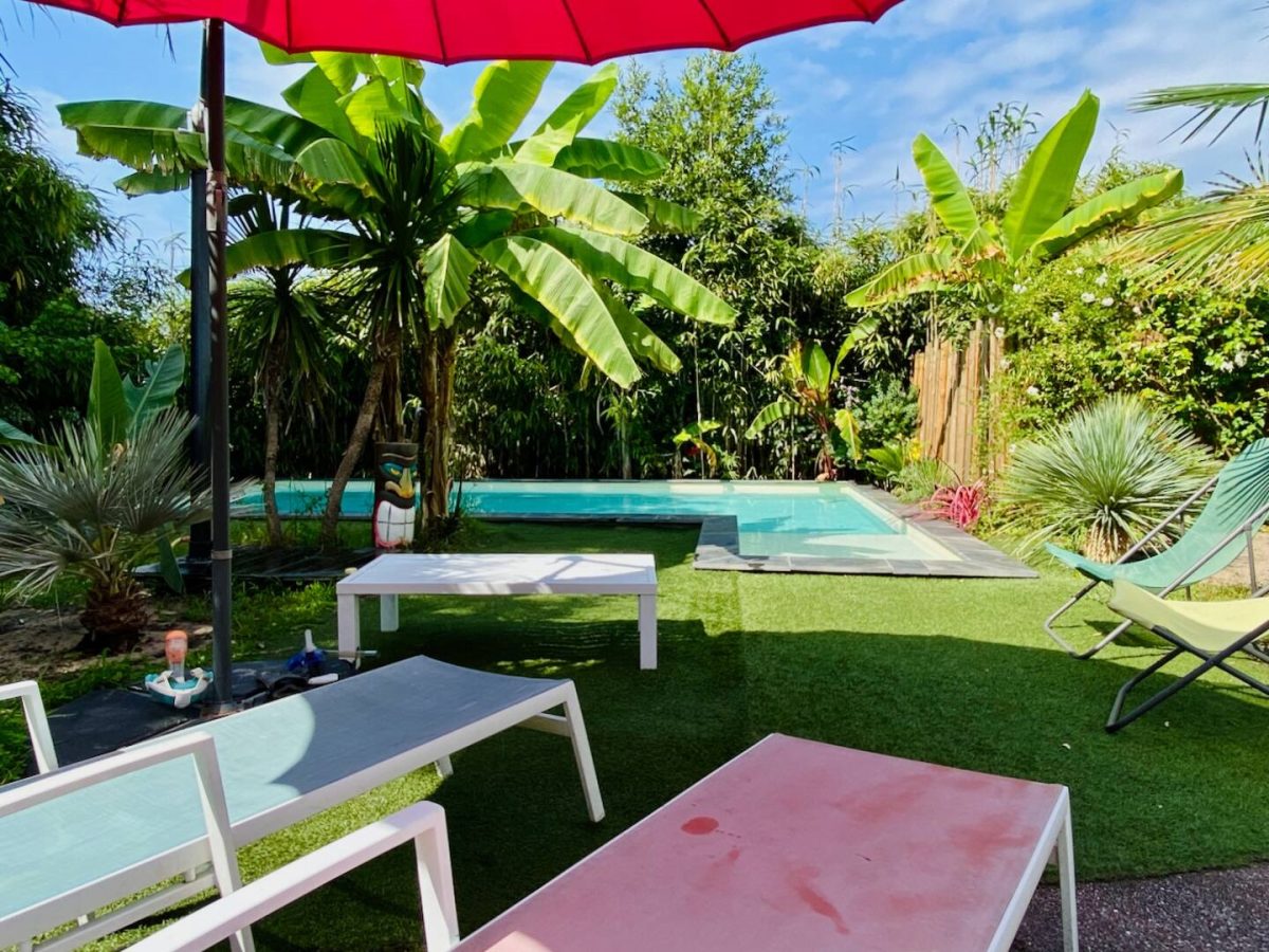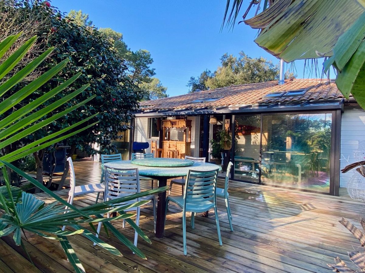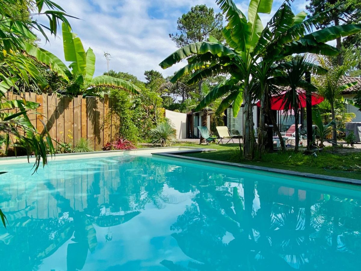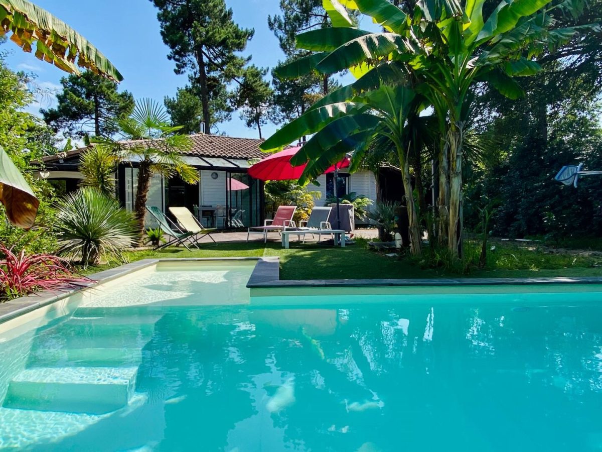 Completely refurbished air-conditioned Landaise villa with heated 8x4 swimming pool with beach surrounded by an exotic garden planted with trees.