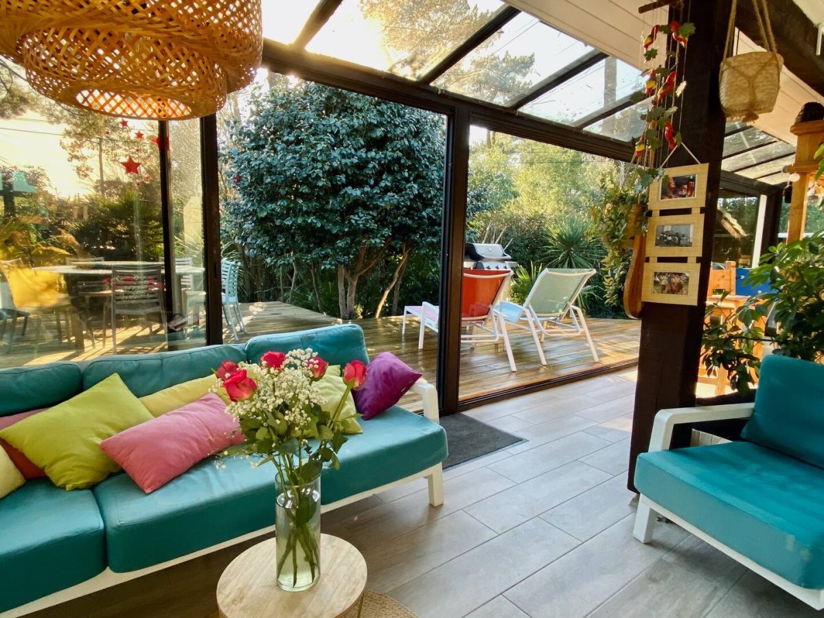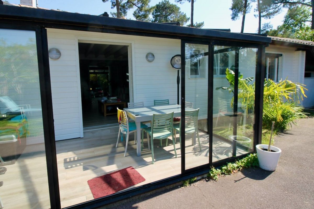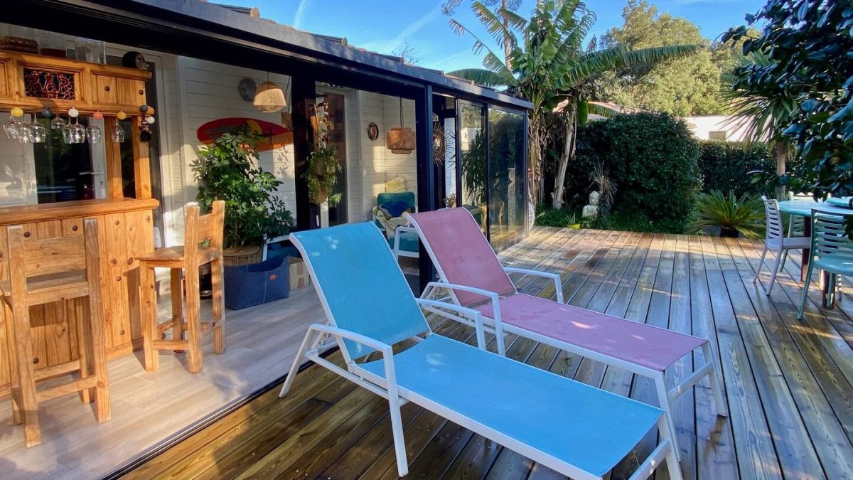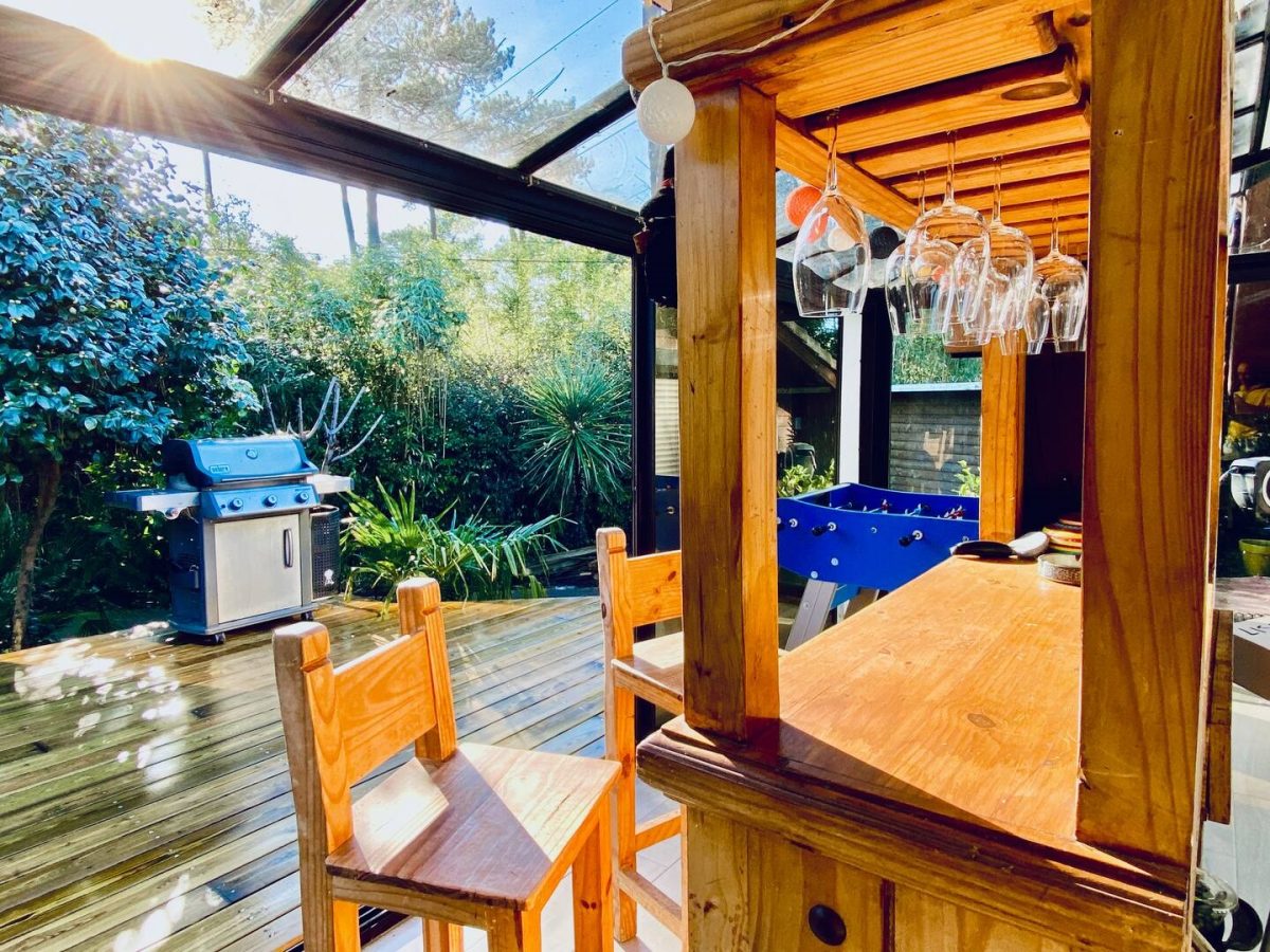 Completely refurbished air-conditioned Landaise villa with heated 8x4 swimming pool with beach surrounded by an exotic garden planted with trees.